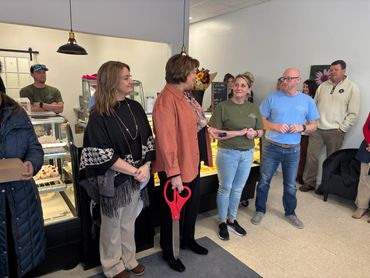 Town officials, business leaders, pastry loving supporters and chamber members joined Edenton Chowan Chamber of Commerce Director Susan Creed in welcoming the new owners of Bayside Bakery.
