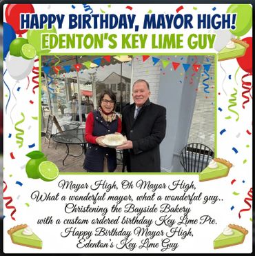 Bayside Bakery and Boards opened Wednesday. The bakery’s hours are Wednesday through Saturday, 7:00 a.m. to 5:00 p.m.. These are subject to change as the demand grows and weather improves. Unbeknownst to most, Mayor Hackney High was celebrating his birthday- at a bakery- and was surprised by wife Martha with a birthday Key Lime pie.